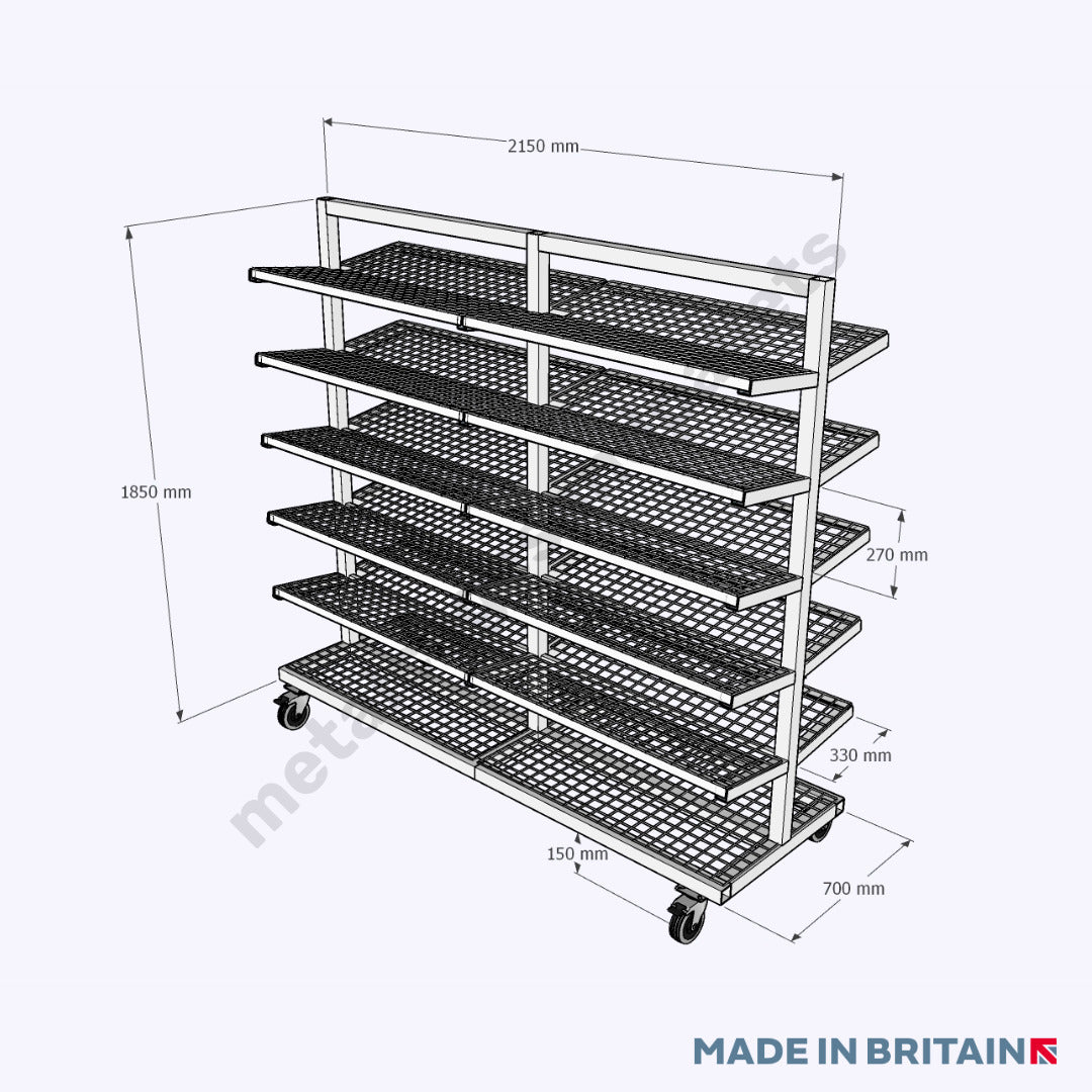The gap between each support is 270mm. Support length is 330mm. This particular pipe trolley features 6 tiers of heavy-duty mesh shelving, making this product suitable for storing shorter or smaller items safely. Please see the above technical illustration for further details.